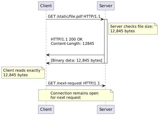 Content-Length represents the straightforward solution. Before sending the response headers, the server determines the exact size of the message body in bytes and includes this value as a header. The receiver reads the headers, extracts the Content-Length value, and then reads exactly that many bytes from the stream. Once those bytes are consumed, the message is complete, and the connection remains open for the next request.