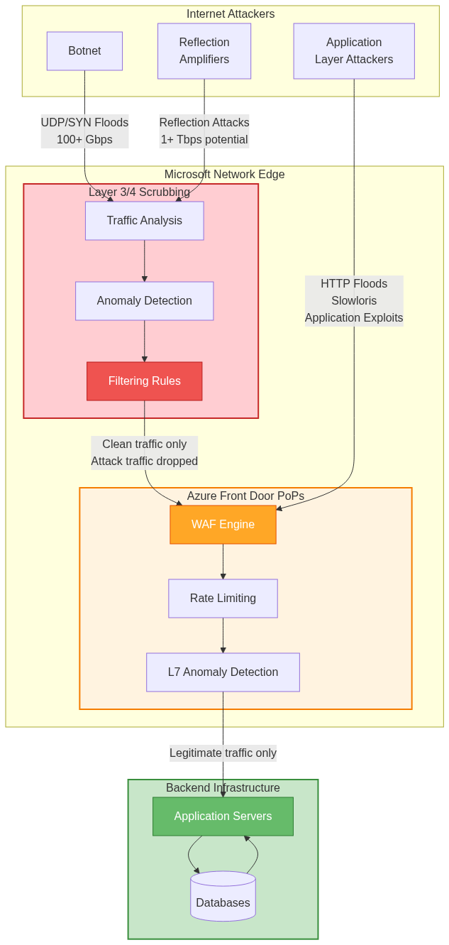 The protection operates through traffic analysis at Azure’s network edge. All traffic destined for Azure Front Door Anycast addresses flows through scrubbing centers, where detection systems analyze traffic patterns continuously. Machine learning models identify anomalous traffic volumes, suspicious packet characteristics, and attack signatures in real time.