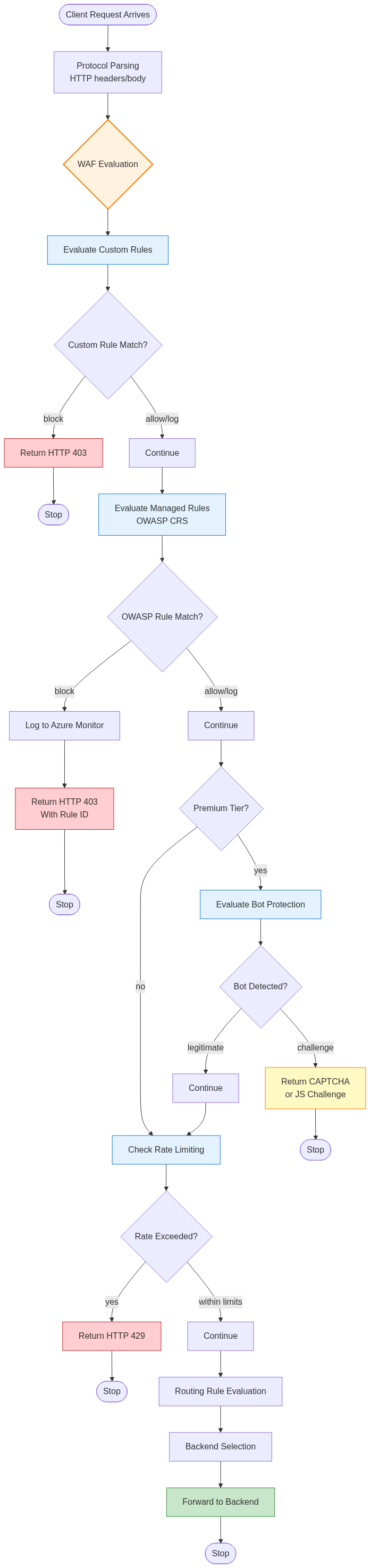 When requests arrive at Azure Front Door edge locations, they undergo protocol processing to extract HTTP methods, URLs, headers, and bodies. The parsed request data flows into the WAF engine, which evaluates configured rule sets sequentially.