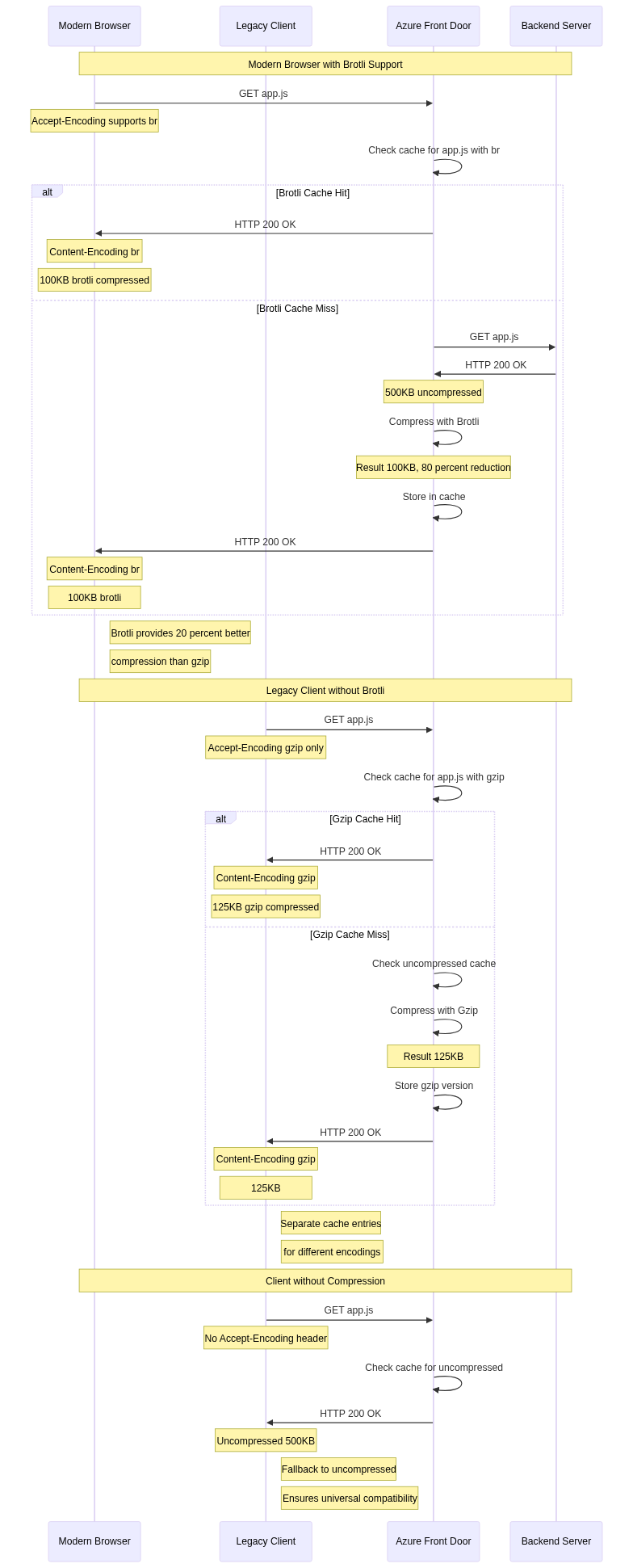 If clients do not support compression, Azure Front Door serves uncompressed content. This fallback ensures compatibility with legacy clients while providing compression benefits to capable clients.
