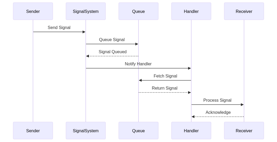 The signal flow architecture is illustrated using a sequence diagram. The diagram shows the interaction between the sender, signal system, queue, handler, and receiver.